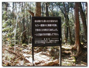 Japonská vláda moc dobře ví, co se v tomhle lese děje, takže když tam vyrazíte na romantickou procházku a sběr hub, kromě napuchlých a hnijících oběšenců tam občas narazíte na cedule, které říkají věci typu: „Život je krásná věc, rozmyslete si to!“ nebo „Pomyslete na svou rodinu!“.