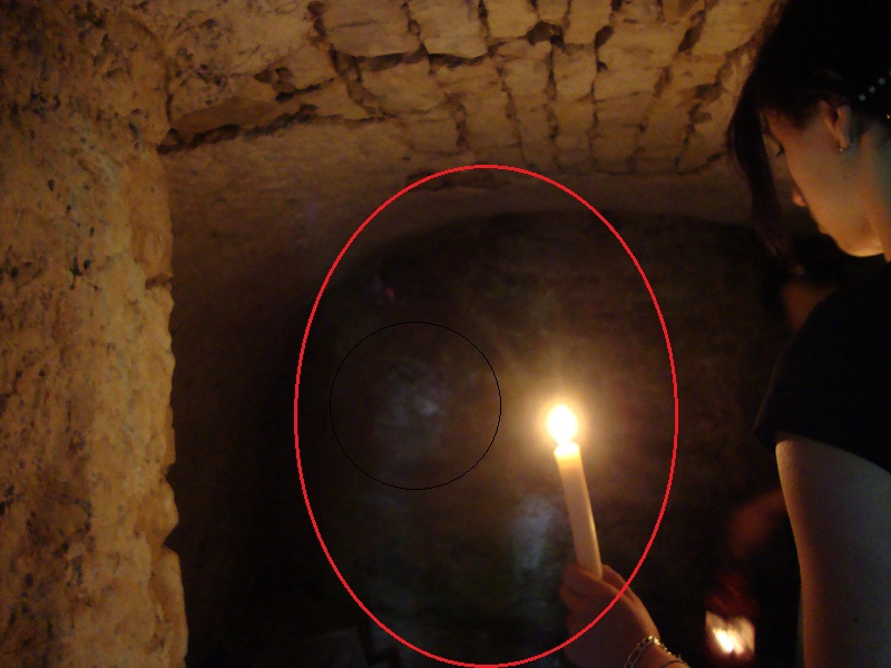 Doma jsme si chtěly vzít baterku, ale zjistily jsme, že nefunguje. Jediná možnost byla vzít svíčky, abychom vůbec něco viděly. Moje kamarádka je z věřící rodiny a měla po ruce jen svěcené svíčky z jejího a bratrova prvního přijímání. Vydaly jsme se do domu a šly jako předtím do sklepa. Bylo to tam staré a zničené, zdi byly počmárané a kolem byly odpadky, takže bylo vidět, že tam rozhodně nějací lidé chodí. Měly jsme sebou foťák a moje sestra si to tam fotila. Šly jsme i po schodech nahoru, koukly se na půdu a prolezly další místnosti, ale nic zajímavého tam nebylo. Když jsem si chtěla vyfotit půdu, sestra říkala, že slyší kroky, jakoby někdo šel po schodech, tak že bychom raději měly jít – napadlo nás totiž, že si nás všimli sousedé a třeba jim vadí, že lezeme tam, kam nemáme. Už to bylo divné, jelikož po schodech vůbec nikdo nešel. Nevěnovaly jsme tomu žádnou pozornost a prostě odtamtud odešly. Další den jsme si prohlížely fotky. To, na co jsme narazily, nám všem třem vyrazilo dech. Na fotografii jsem já, jak držím svíčku. Je to focené bez blesku a všude okolo byla úplná tma. Jediné světlo tvořila svíčka. Všechny tři jsme se shodly na tom, že na fotografii je rozzlobená tvář, a vedle ní něco dalšího, co nám připomíná kozla..